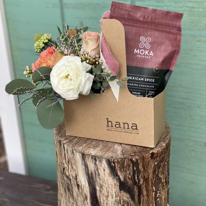 Price: $45.00Gift Set ( Flower arrangement + Drinking Chocolate) in a carrier